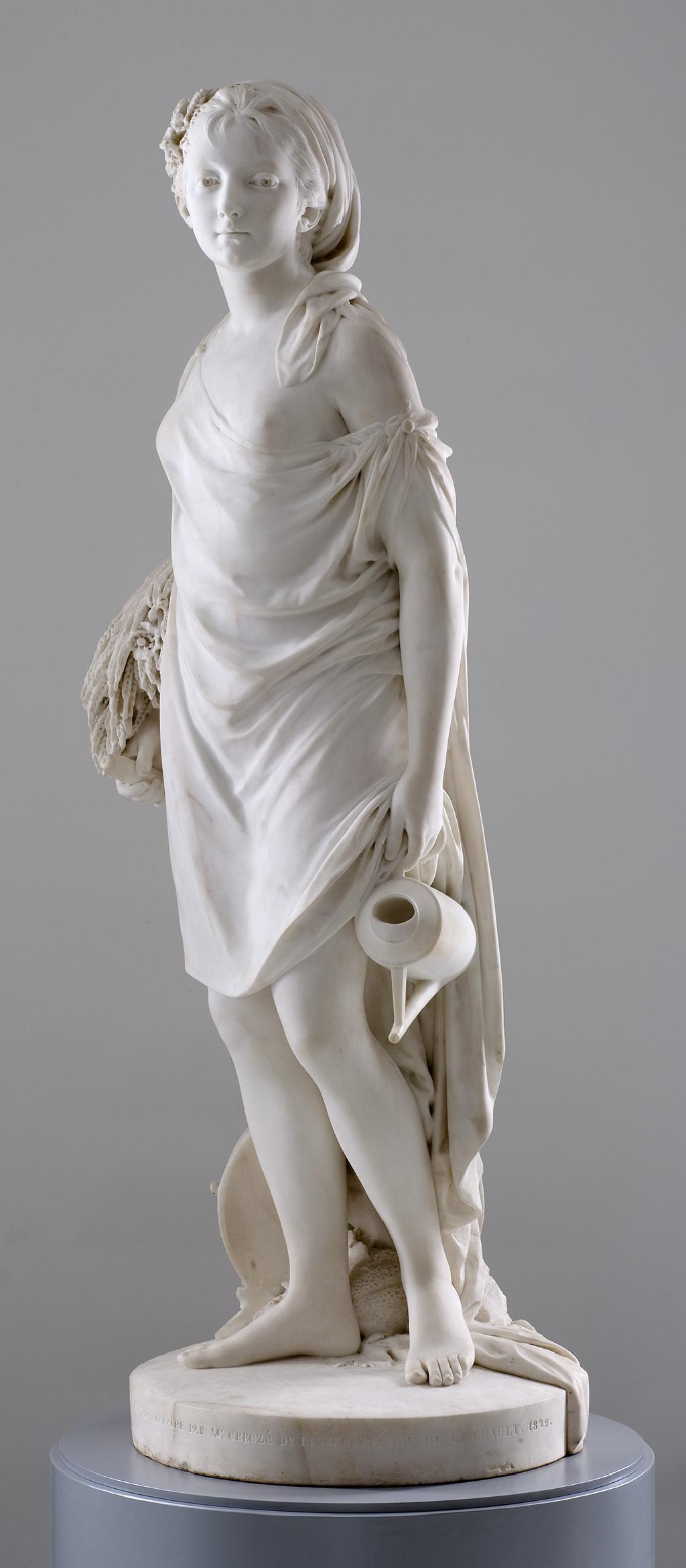 Comme pour La Frileuse, le modèle de L’Été fut conçu en 1781 pour Anne Charles Modenx de Saint- Wast. Pour des raisons que l’on ignore, Houdon modifia la taille de la statue, qui est datée de 1785, et se contenta d’abord de réaliser un buste en plâtre, daté de 1782 (collection particulière). Traditionnellement, les représentations de l'été, pour faire contraste à l'hiver, mettaient en valeur une jeune paysanne avec blé, fleurs et fruits qui faisait bien sûr penser à Cérès, déesse des Moissons. Houdon s’en tient pour une part à cette iconographie en accompagnant sa figure d’une faucille et d’une gerbe de blé. Mais il prend aussitôt ses distances avec l’évocation de la déesse antique, dont il connaissait le mythe tragique à travers la recherche éperdue de sa fille Proserpine, ravie aux enfers par Pluton. Houdon préfère nous offrir l’image d’une fière et réjouissante petite paysanne qui tient de la main gauche un arrosoir moderne (qui fait écho à l’urne brisée du pendant et symbolise l’eau vive qui s’écoule) et qui a négligemment retenu ses cheveux, agrémentés d’épis de blé, dans un foulard comme pour les travaux des champs à la belle saison. À ses pieds figurent des fleurs et des fruits (raisin, pomme, grenade) ainsi qu’un tambour de basque, symbole de fête. La courte tunique qui rappelle vaguement l’antique et qui retombe sur le bras met en valeur le corps juvénile, ferme et délicat à la fois. Le beau visage empreint d’une noble assurance rayonne dans tout l’éclat de la jeunesse. Les mèches sur le front, le regard bien marqué, l’extrémité du fichu retombant sur l’épaule, procurent à l’ensemble un naturel et une présence inoubliables. Autant La Frileuse est ramassée sur elle-même, les mains croisées sur la poitrine, les jambes fléchies, le visage dissimulé dans l’ombre du grand châle, autant la figure de L’Été, comme il sied à cette saison heureuse, se déploie dans l’espace, chargée avec aisance de ses attributs, et regarde avec confiance vers l’extérieur