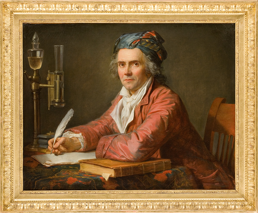Présenté au Salon de 1783 avec La Douleur d’Andromaque (musée du Louvre), ce portrait est celui d’Alphonse Leroy, célèbre gynécologue qui fut sans doute l’obstétricien de l’épouse du peintre. Docteur aux pratiques controversées, il incarnait le renouveau de la médecine. Représenté comme un savant à l’étude dans son cabinet de travail, sur un fond neutre caractéristique de David, il est vêtu d’une ample robe de chambre et d’un turban, dans le cadre intime de son intérieur. Dans un souci de vérité qui n’entache cependant pas la sobre dignité du savant, l’infirmité de Leroy – il était manchot – est dissimulée dans les plis de la manche au premier plan où n’apparaît aucune main. Dans ce portrait tout à la fois social et réaliste, David montre le médecin accompagné des attributs de sa profession, accoudé sur un ouvrage d’Hippocrate traitant des maladies féminines, le De morbis mulierum, et éclairé par une lampe à mèche cylindrique dite « lampe à quinquet », récemment inventée par Antoine Quinquet et que Leroy avait perfectionnée. Ce symbole de modernité technique rapproche aussi cette image des représentations les plus classiques, le livre et la lampe étant les attributs de l’étude chez Cesare Ripa (Iconologia, 1593). Le soin apporté à la qualité et à la texture des étoffes, l’expression du modèle, saisie alors qu’il s’apprête à écrire, concourent à cette représentation pleine de vie ; ils la rattachent à la tradition du portrait français du xviiie siècle qu’illustrèrent Rigaud, Van Loo, Aved ou Quentin de La Tour et annoncent déjà le Portrait du chimiste Lavoisier et de sa femme, peint en 1788 (New York, The Metropolitan Museum of Art).