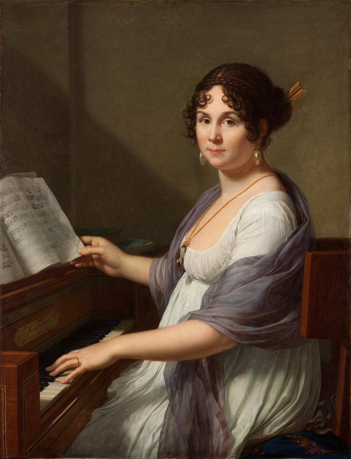 Ces deux magnifiques portraits, absents de la grande rétrospective « François-Xavier Fabre (1766-1837). De Florence à Montpellier » en 2007, ont pu dans la foulée intégrer les collections du musée. C’est à Florence, en 1802, que l’artiste fait la connaissance de Bertin et de son épouse. L’homme, d’abord enthousiasmé par la Révolution, ne cache pas l’indignation que lui causent ses excès. À la tête du Journal des débats, au lendemain du 18 brumaire, il a le tort de déplaire à Bonaparte qui le fait emprisonner puis exiler à l’île d’Elbe. Il obtient de terminer son exil dans la péninsule et regagne Paris en 1805 où il dirige une publication d’opposition, le Journal de l’Empire. Partisan d’une monarchie constitutionnelle à l’anglaise, il sera immortalisé par Ingres en 1832 dans un célèbre portrait aujourd’hui au musée Louvre. Fabre se lie d’amitié avec le patron de presse et entretient avec lui des relations amicales, ponctuées de quelques éclipses. C’est pour lui qu’il exécute en 1808 un important Jugement de Pâris (Richmond, Virginia Museum of Fine Arts). Pour le portrait masculin, Fabre s’en tient à la formule du portrait davidien : cadrage à mi-corps, sobriété du décor, réalisme du visage. L’expression est douce, méditative, à peine voilée de nostalgie avec le visage au teint pâle et la cascade de cheveux gris. Le livre relié nous renseigne sur les préoccupations intellectuelles du modèle et égaye quelque peu cette effigie austère et digne. Tout à l’opposé se situe le portrait de son épouse (soeur du critique d’art aux Débats, Jean-Baptiste Boutard) : faisant face au spectateur, la jeune femme esquisse un demi-sourire et s’apprête à tourner une page de la partition. Les rondeurs délicates des chairs, admirablement mises en valeur par le demi-jour du fond, les arabesques du vêtement qui s’opposent à la géométrie du mobilier, la palette raffinée de blanc et de bleu lilas, les ornements précieux et comme ciselés (camée, flèche d’or) composent un instantané plein de charme et de poésie. Les doigts du modèle égrènent quelques notes à jamais silencieuses. En 2017, le musée a acquis une réduction du portrait masculin, datant de 1804 : avant l’invention de la photographie, il était fréquent que les modèles des portraits commandent des copies destinées à des familiers ou à des amis. L’extrême qualité de celle-ci laisse supposer une destination privilégiée.
