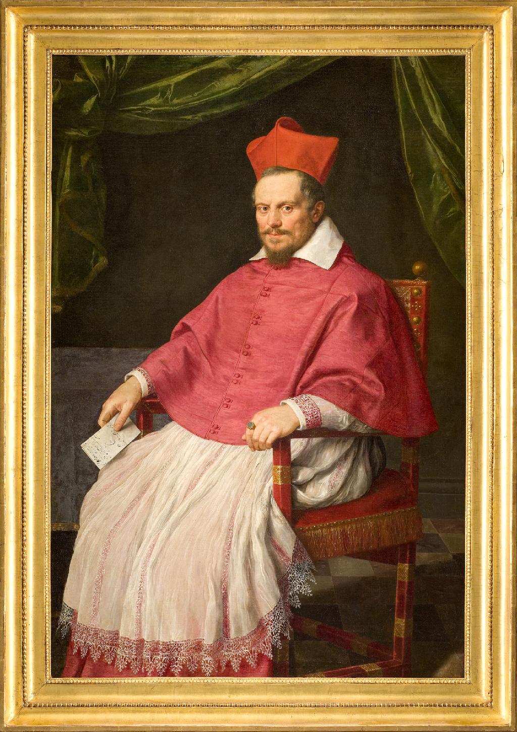 Cette spectaculaire effigie, l’un des plus beaux témoignages de l’art du portrait au XVIIe siècle européen, représente le prélat Giovanni Bonsi, né à Florence en 1554, qui francisa son nom en Jean de Bonsy quand il devint évêque de Béziers en 1598 (plusieurs membres de sa famille occupèrent cette fonction aux XVIe et XVIIe siècles). Après avoir étudié le droit à Padoue, exercé la profession d’avocat à Rome, il fut nommé sénateur par Francesco de Médicis en 1600. Il prit une part active dans la conclusion du mariage du roi de France Henri IV avec Marie de Médicis qu’il accompagna en France, et dont il devint le premier aumônier. Le pape Paul V le nomma cardinal en 1611 et Louis XIII présida à son investiture à Fontainebleau. En tant que député du clergé du Languedoc, il assista aux États généraux en 1614. Au printemps 1615, Bonsy se fixe définitivement à Rome où il continue d’oeuvrer pour les relations entre la France et la papauté, soutenant aux côtés de ce pays l’élection du pape Grégoire XV Ludovisi en 1621, année de sa disparition. Il est probable que le portrait ait été exécuté dans la Ville éternelle vers 1615, au moment de l’installation du cardinal. L’un des plus brillants héritiers de l’école des Carrache, décorateur et peintre d’histoire talentueux (La Dernière Communion de saint Jérôme, 1614, conservée à la pinacothèque du Vatican, fut durablement louée et admirée), Dominiquin s’intéresse peu à l’art du portrait. D’emblée, il réalise pourtant un coup d’éclat et s’inscrit dans la grande lignée des portraitistes officiels depuis Raphaël (Portrait de Léon X, Florence, musée des Offices) jusqu’à Pulzone et son contemporain Rubens, coup d’éclat renouvelé dans son Portrait du pape Grégoire XV et du cardinal Ludovico Ludovisi (Béziers, musée des Beaux- Arts). Les dessins conservés à Windsor Castle montrent dans une phase précoce une recherche de mouvement et d’animation. La composition sobre et équilibrée, au final, tend à subordonner tous les détails à l’expression du visage qui capte d’abord l’attention du spectateur : regard oblique et pénétrant, pétillant de malice, large front, légère tension des muscles faciaux, esquisse d’un sourire sur les lèvres. La splendeur chromatique, avec les rouges scintillants du bonnet, du camail et de la garniture du fauteuil, le beau vert moiré du rideau, le blanc éclatant du col et du surplis, la ciselure des dentelles, des broderies et de la passementerie enlevée avec un soin virtuose, l’intimité de la pièce formant écrin, l’extraordinaire présence psychologique du modèle confèrent à l’ensemble une autorité toute classique et une qualité de chef-d’oeuvre