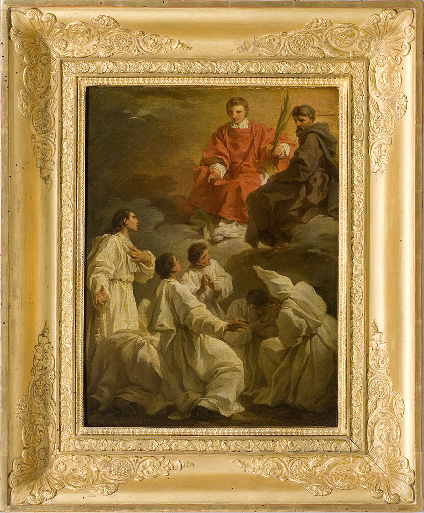 Le Languedocien Subleyras s’est formé à Toulouse auprès d’Antoine Rivalz (1667-1735). Après son installation à Paris, il gagne le grand prix en 1727 et part l’année suivante pour devenir pensionnaire de l’Académie de France à Rome. Il ne reviendra pas et vivra jusqu’à sa mort dans la Ville éternelle dont il sera l’un des peintres éminents. Auteur de quelques scènes de genre, de portraits, dont certains prestigieux de saints en voie de canonisation commandés par la Curie (Portrait de la Vénérable Battistine Vernazza, 1739, musée Fabre), il fut surtout célèbre pour ses sujets religieux. Ce petit tableau est un modello préparatoire pour une oeuvre inconnue destinée certainement à l’autel d’une chapelle de pénitents. Son style est comparable à celui d’un autre modello, celui du Mariage mystique de sainte Catherine de Ricci (vers 1745, Northampton, Smith College Museum of Art), confortant une datation assez tardive. La composition, inspirée des modèles bolonais du xviie siècle, la clarté de la lumière et du coloris dominé par des gammes de blanc et de beige caractéristiques de Subleyras, la noblesse d’attitude des pénitents à la présence intense, le calme hiératique des saints définissent l’art classicisant et intériorisé du peintre, en réaction au baroque romain de Carlo Maratta (1625-1713) et de ses continuateurs. Les visages, petits, avec leur nez mince, stéréotypés, rappellent ceux de Donato Creti (1671-1749). Un peu plus tard, en 1747, sa Messe de saint Basile (aujourd’hui conservée à Rome, basilique Sainte- Marie-des-Anges) commandée par le pape pour orner Saint-Pierre le consacrera plus grand peintre de Rome. Gravement malade, il meurt deux ans plus tar
