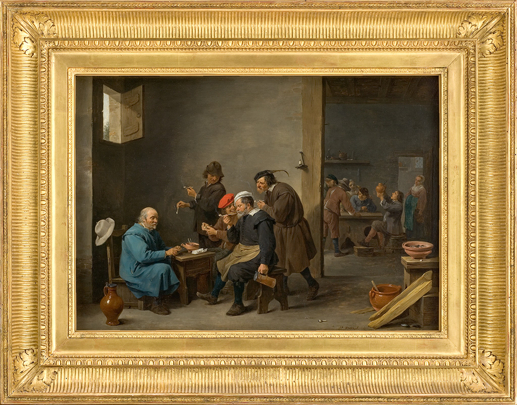 La Tabagie dite L’Homme au chapeau blanc date de la meilleure période de l’artiste alors détaché de l’influence des gueuseries truculentes et sarcastiques d’Adriaen Brouwer (vers 1605/1606-1638). Les paysans occupés à leurs divertissements favoris, fumer et boire, semblent détendus, parfois perdus dans leur rêverie, comme le vieil homme en bleu. La monumentalité des figures, le dessin précis et économe participent à cette impression de pondération et d’équilibre dans les plaisirs. Le camaïeu gris et brun est relevé de rares touches de couleurs bleu, blanc et rouge : au xviiie siècle, ce tableau était célèbre sous le titre de L’Homme au chapeau blanc. Teniers a multiplié dans les années 1640-1650 les scènes de tabagie, variant à l’infini les compositions et le coloris, tels Les Joueurs de cartes (1645), conservés au musée des Beaux-Arts de Strasbourg et au musée du Louvre.